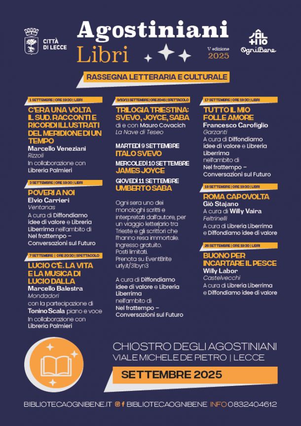 Agostiniani Libri è la rassegna letteraria e culturale del Comune di Lecce e della Biblioteca Ognibene che accompagnerà il pubblico per tutto settembre con presentazioni, incontri, spettacoli e momenti di approfondimento, realizzata e promossa in collaborazione con Liberrima, altre librerie, case editrici e associazioni del territorio. Vi aspettiamo a Lecce nel Chiostro degli Agostiniani, Viale Michele Di Pietro 10.